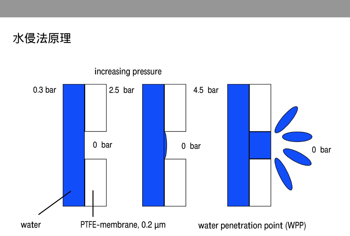 WIT是以水為介質(zhì)進(jìn)行測(cè)試的,施加的壓力必須足以克服膜孔中的毛細(xì)管壓力才能使水自由流過(guò)疏水微孔膜的膜孔,這個(gè)起始臨界壓力叫作“水穿透點(diǎn)壓力(WPP)”,WPP由過(guò)濾膜的材質(zhì)和疏水性決定,與膜孔徑呈反比。