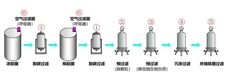 在整個大、小容量注射劑不同工藝階段過濾都有著非常廣泛的應用,主要有脫碳過濾、除顆粒和降低微生物負荷的預過濾、氣體的除菌過濾、冗余過濾和終端產品的除菌過濾等,主要的過濾位點有: