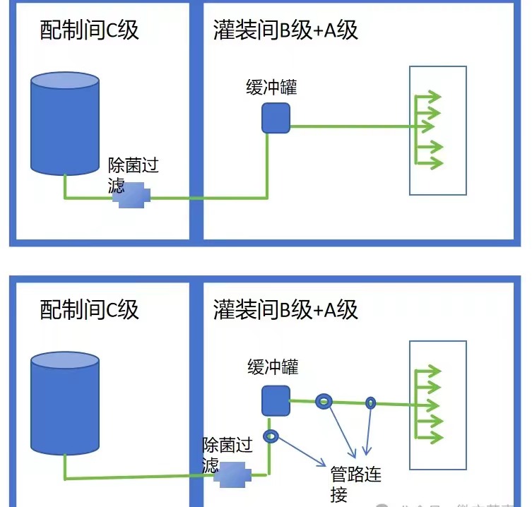 我的問題是下面兩個(gè)圖,哪個(gè)更符合“除菌過濾濾器應(yīng)當(dāng)盡可能接近灌裝點(diǎn)”?