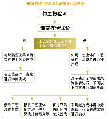 細(xì)菌截留試驗(yàn)的研究目的是模擬實(shí)際生產(chǎn)過(guò)濾工藝中的最差條件(過(guò)濾溫度相對(duì)越高,過(guò)濾時(shí)間越長(zhǎng),批量越大,壓差越高越是最差條件),過(guò)濾含有一定量挑戰(zhàn)微生物的產(chǎn)品溶液或者產(chǎn)品替代溶液,以確認(rèn)除菌過(guò)濾器的微生物截留能力。在進(jìn)行細(xì)菌截留試驗(yàn)測(cè)試前,活度實(shí)驗(yàn)(生存性實(shí)驗(yàn)),確認(rèn)挑戰(zhàn)微生物于工藝條件下在藥品中的存活情況,以確定合理的細(xì)菌挑戰(zhàn)方法。