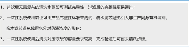 具體的待過濾介質(zhì),結(jié)合特定的工藝條件而實施的驗證一般包括細菌截留試驗、化學兼容性試驗、可提取物和浸出物試驗、安全性評估和吸附評估等。實際生產(chǎn)過程中操作參數(shù)和允許的極值在驗證時已被覆蓋。