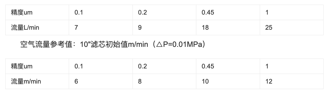 純水流量參考值:10"濾芯初始值L/min(△P=0.01 MPa, 1厘泊粘度,25℃)
